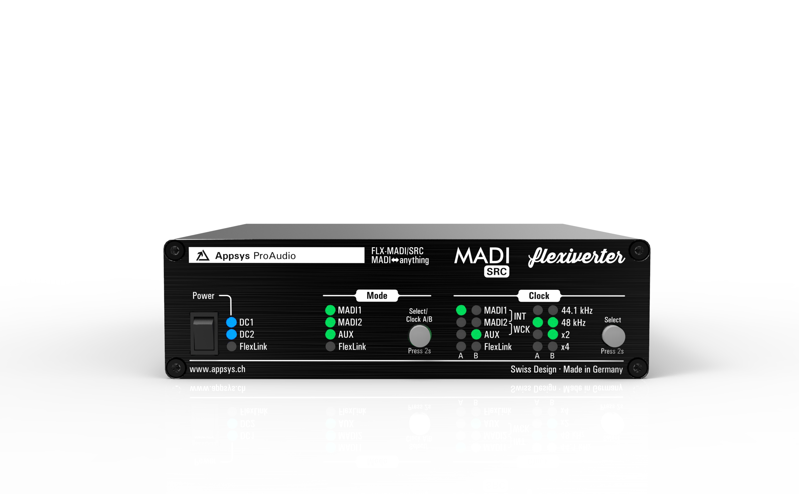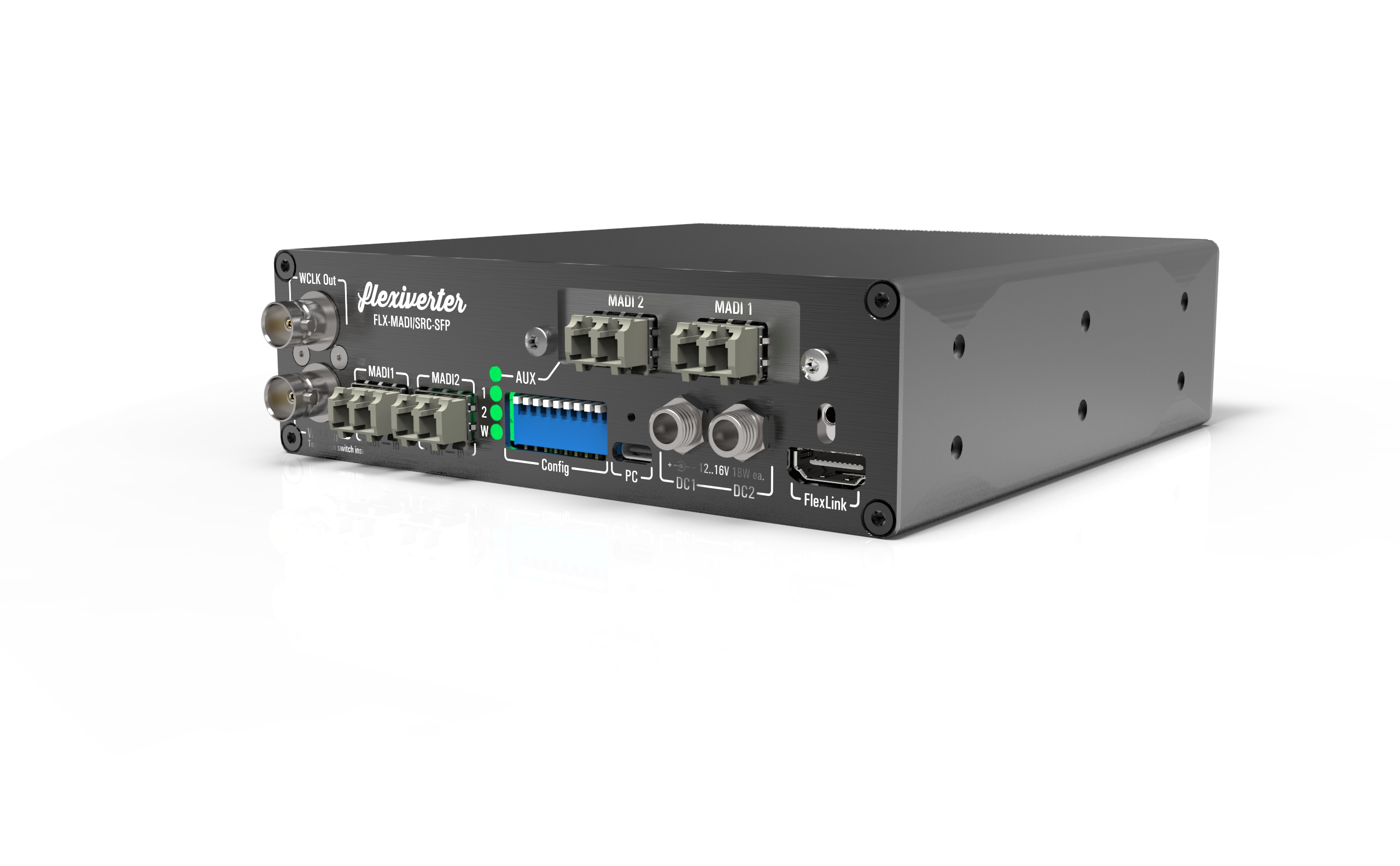 The FLX-MADI/SRC-SFP is a compact MADI-to-anything converter with built-in 64x64ch Sample Rate Converter (SRC). It can convert 64x64ch (even at 96k) of MADI to to any protocol installed into the AUX slot. For larger systems, the built-in channels plus everything which the AUX card provides are also available on the FlexLink port, making it possible to use it as extension to the MVR-mkII or another Flexiverter.